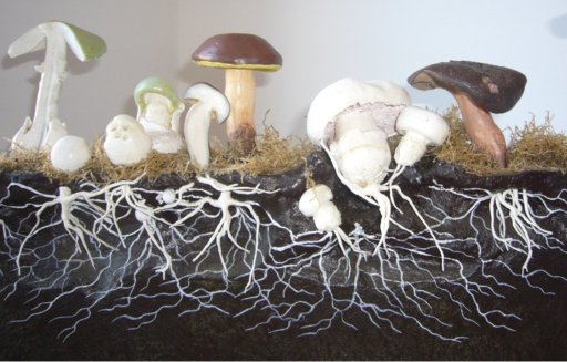 After gaining fame in best-selling books describing the “wood-wide web,” fungi are beginning to star in new stories of everything. Unlike the single cell that serves as the prototype for systems theory, fungi are entirely decentralized and essentially unbounded branching threads that intertwine and bond with other organisms to exchange and transmit substances as well as information across extensive underground networks. Fungi exist everywhere in the environment, constituting 20-30% of soil biomass, with 90% of all plants living in symbiosis with mycorrhizal fungi. Through photosynthesis plants extract carbon from the atmosphere to incorporate into their own bodies, from which fungi draw their own supply. In return they provide up to 80% of plants’ nitrogen and phosphorus for plant growth and further support resilience from drought and stresses as they enhance soil structure and distribute water.